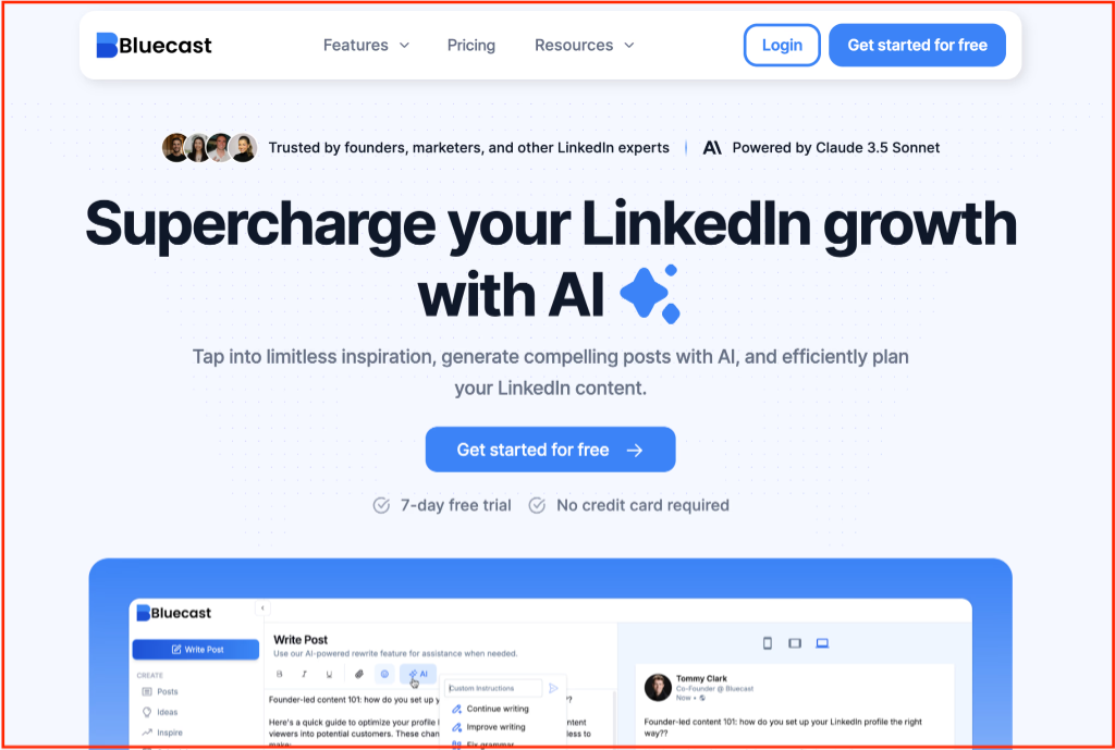 Bluecast is an all‑in-one AI-powered LinkedIn content tool aimed at creators, marketers, and B2B professionals who want to simplify their content workflow. It helps you generate post ideas, draft LinkedIn‑ready posts (or repurpose content), and schedule them, all within a unified dashboard.