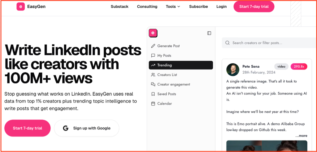 EasyGen focuses entirely on one job: helping you publish more often with less effort. It’s especially helpful for busy creators who know what they want to say but need help saying it quickly, or who want to ride LinkedIn trends without spending hours researching.