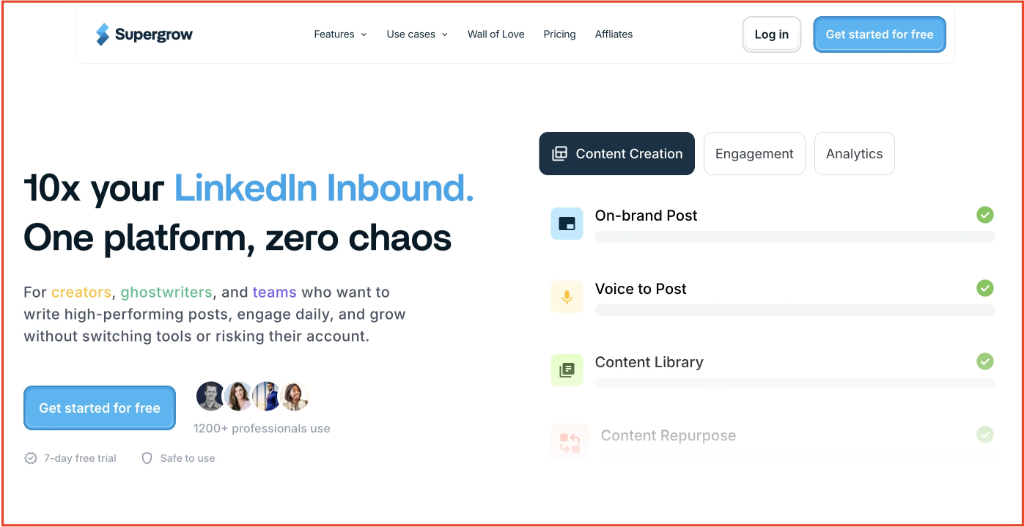 Like Maaxgrow, Supergrow avoids risky automation, focusing instead on tools that help you publish confidently and engage meaningfully. It provides a comprehensive suite of features to manage your LinkedIn presence.