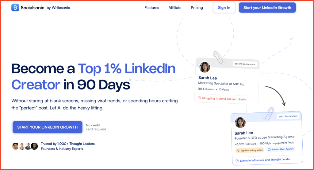 Socialsonic brands itself as an all‑in‑one AI LinkedIn growth platform — aiming to solve the most common problems creators face: idea droughts, inconsistent posting, and lack of time.